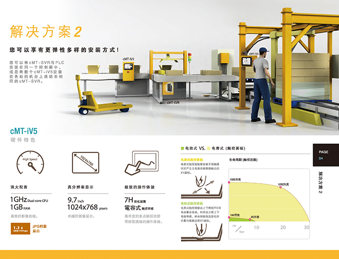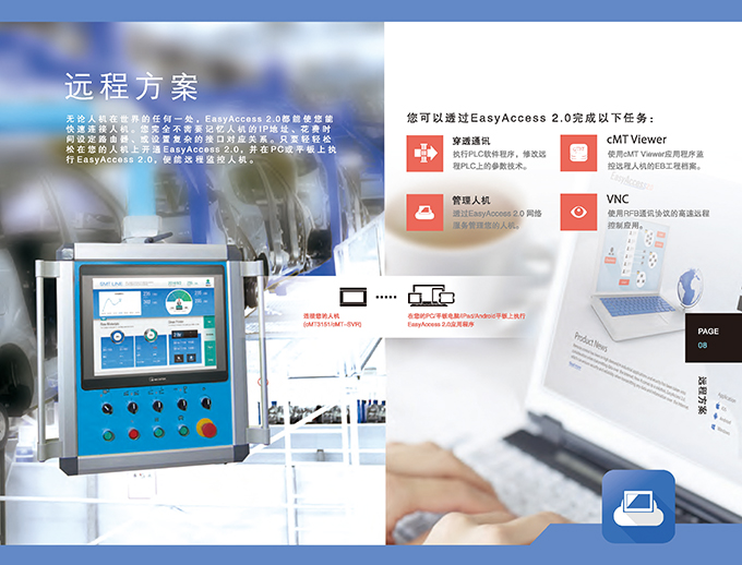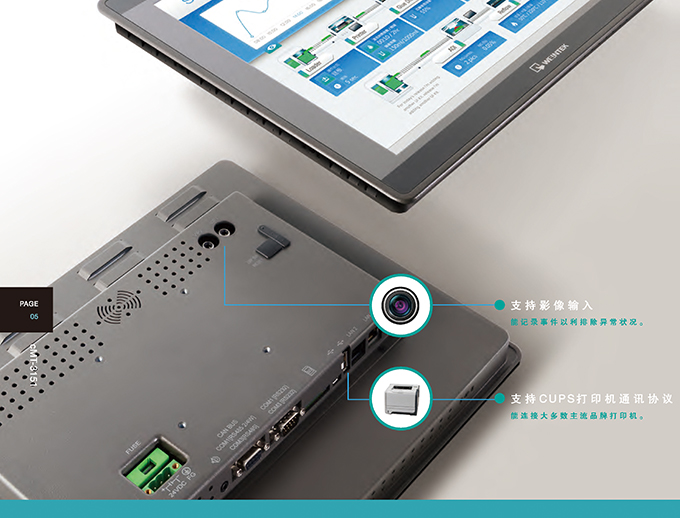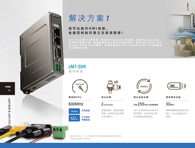 cMT突破傳統(tǒng)一機(jī)一屏架構(gòu),并且真正無屏幕機(jī)型,率先展示威綸通科技創(chuàng)新cMT架構(gòu)的跨世代產(chǎn)品。新產(chǎn)品cMT-SVR-200同樣忠實(shí)呈現(xiàn)cMT架構(gòu)的特性,將一機(jī)多屏,一屏多機(jī)都完美的實(shí)現(xiàn),使用平板、手機(jī)或PC就能輕松且有效率地使用cMT Viewer操作與監(jiān)控。不在設(shè)備現(xiàn)場(chǎng)時(shí),利用EasyAccess 2.0更能通過遠(yuǎn)程直接監(jiān)控,以及進(jìn)行遠(yuǎn)程PLC穿透。人機(jī)本體無屏幕的設(shè)計(jì),可以直接安裝于控制箱中,免除了屏幕耗損的顧慮;即便現(xiàn)場(chǎng)設(shè)備上需要屏幕顯示時(shí),也只要安裝一臺(tái)cMT-iV5即可。與前代產(chǎn)品比較,cMT-SVR-200導(dǎo)入寬電壓輸入設(shè)計(jì),能夠適應(yīng)更多電源環(huán)境。Wi-Fi功能支持802.11b/g/n通訊標(biāo)準(zhǔn)與WPA/WPA2安全模式,即使在復(fù)雜的工控環(huán)境中,也能有效地、精確的、安全地傳送重要的數(shù)據(jù)。