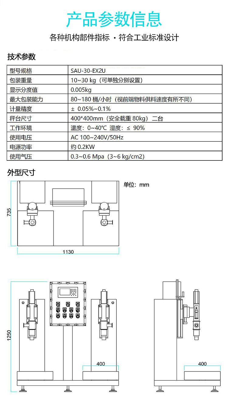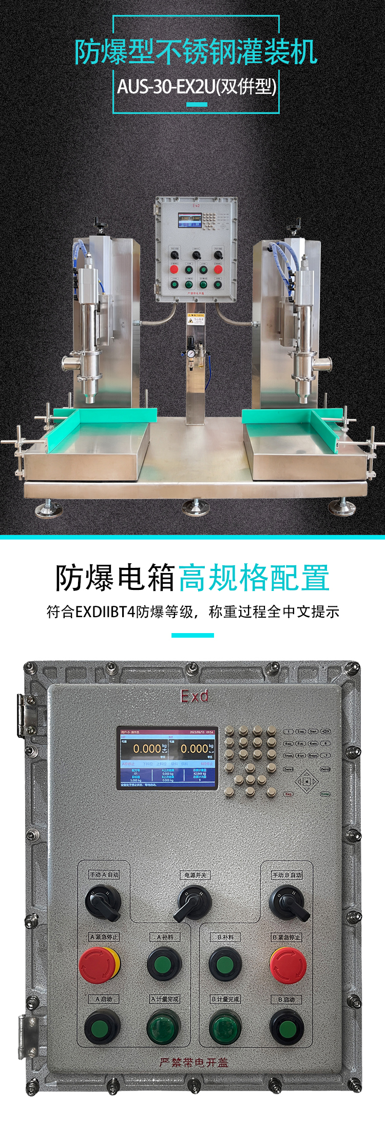 產(chǎn)品描述:SAU-30-EX2U不銹鋼防爆雙併定量灌裝機(jī)主要適用于對油類、油墨、樹脂、膠水等流動性好的液態(tài)物料,可適用于10-30Kg范圍的各式金屬桶或塑料桶容器定量灌裝,灌裝過程皆由內(nèi)置系統(tǒng)自動...